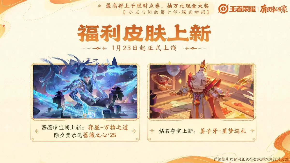珍宝阁上线弈星的皮肤,姜子牙的皮肤是勇者,弈星的皮肤是史诗,但弈星皮肤获得难度比姜子牙高,玩家需要用蔷薇之心来兑换。为了给大家减负,1月28日玩家登录游戏就能获得25个蔷薇之心,加上玩家之前囤的道具,足够拿下弈星的新皮肤。